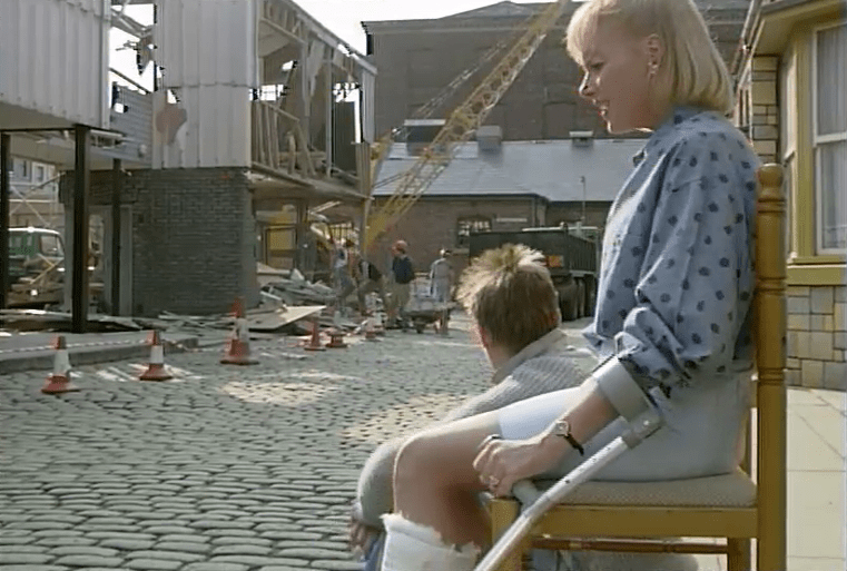 Curly and Sally watch the demolition ©ITV 1990: Construction of the new terrace is completed, with a salon, garage, commercial unit (later, factory) and newsagents built alongside. The Viaduct Street arch is filled to make another commercial unit which is dressed as a joinery to hide the newly-opened Stage One.