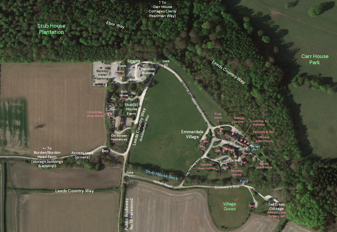 Legally known as Emmerdale Village (originally ‘Emmerdale Farm Village’), the land is leased to ITV Studios until June 2027 by the Earl of Harewood, Viscount Lascelles – a TV producer and cousin of the King. As well as the village set, the adjacent Stub House Farm and nearby Burden Head Farm (known as Wishing Well Farm and Melby Farm in the programme) are also used for filming and production purposes, with a facilities building and associated cast and crew accommodation located at Stub House Farm. There is also a sewage treatment facility on site to make clean the wastewater pumped into Stub House Beck.
