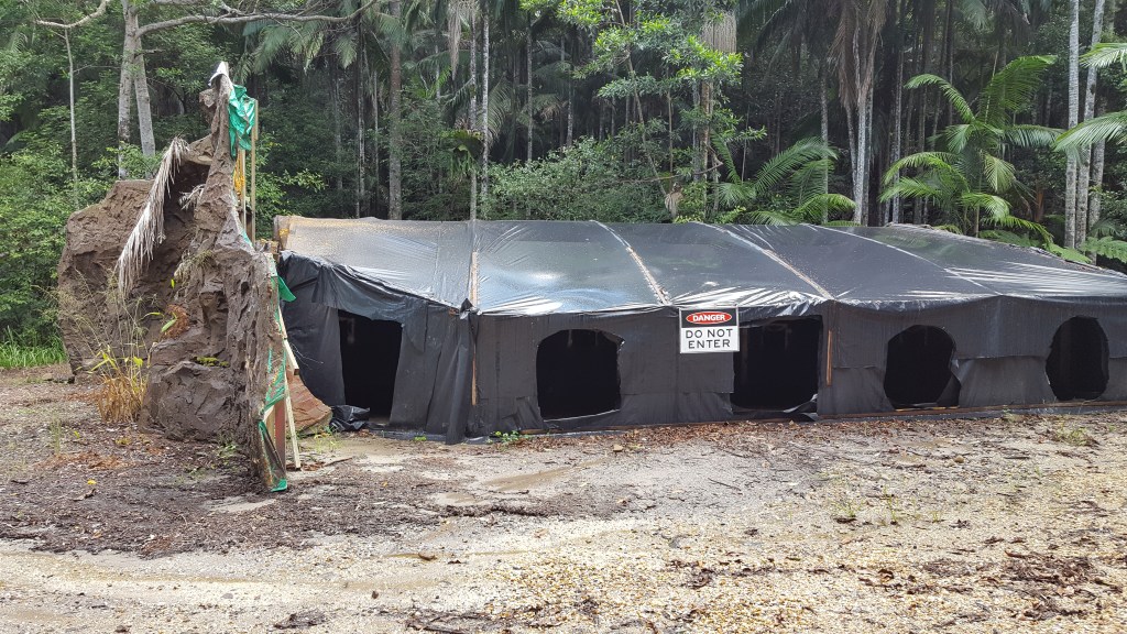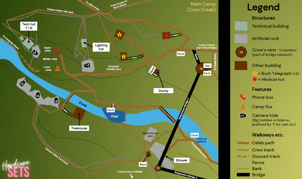 The camp itself is technically at no. 486, but most of the site is on land forming part of no. 366, a cattle farm and homestead owned by Craig Parker who was arrested in 2016 after “slapping” an ITV security guard. Ongoing tensions have led to rumours that the filming location may be set to move, but this so far has only occurred temporarily during the height of COVID-19 when two series were filmed in Wales – and for I’m a Celebrity… South Africa which was filmed along the Blyde River in Mpumalanga.